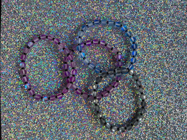 6mm iridescent glass beads paired with 3mm seed beads on a stretch cord.
